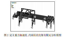 3.4載荷,捆綁的模仿定義重力加速度9800mm/s2,在支架立柱底端及其他相應方位施加捆綁。如圖2所示,為定義重力加速度,捆綁后的ANSYS仿真圖。