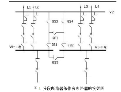 單母線系統(tǒng)分段帶旁路母線接線:為節(jié)約建設(shè)投資。常以分段斷路器兼作旁路斷路器的接線。兩段母線均可帶旁路母線,正常時旁路母線W2不帶電,分段斷路器QF1及隔離開關(guān)QS1QS2在閉合狀態(tài),QS3、QS4QS5均斷開,以單母線系統(tǒng)分段方式運(yùn)行,見圖4。